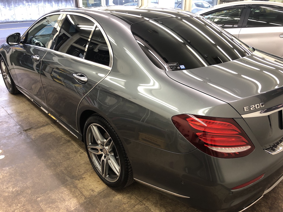 「メルセデス・ベンツ Eクラス」にガラスコーティングを施工しました。こちらのお客様は日頃から車のメンテナンスを丁寧にされており、弊社の職人も驚くほど細かなところまでメンテナンスをされておりました。